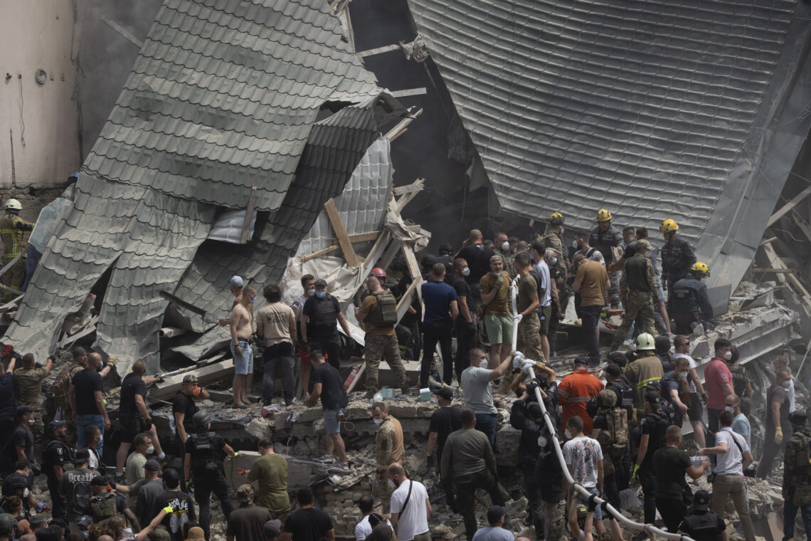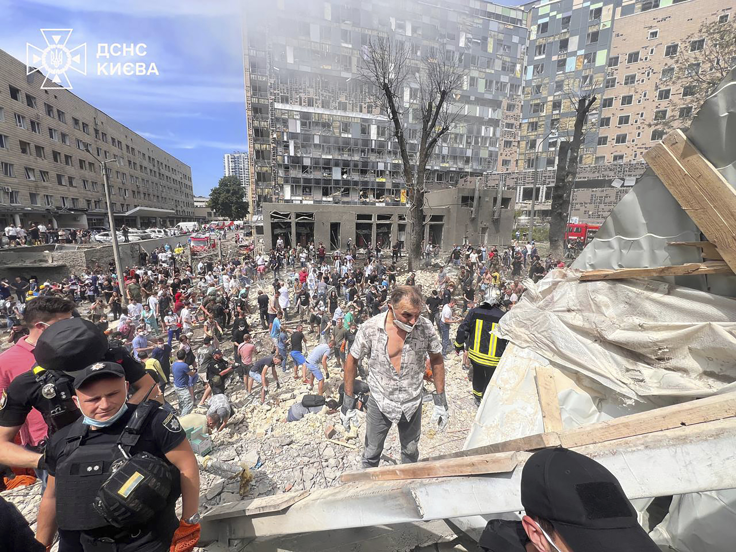 In this photo released by Ukrainian State Emergency Service, people and rescuers work at the site of Okhmatdyt children’s hospital hit by Russian missiles, in Kyiv, Ukraine, Monday, July 8, 2024. Russian missiles have killed several people and struck a children’s hospital in the Ukrainian capital, Kyiv, authorities say. (Ukrainian State Emergency Service via AP)
