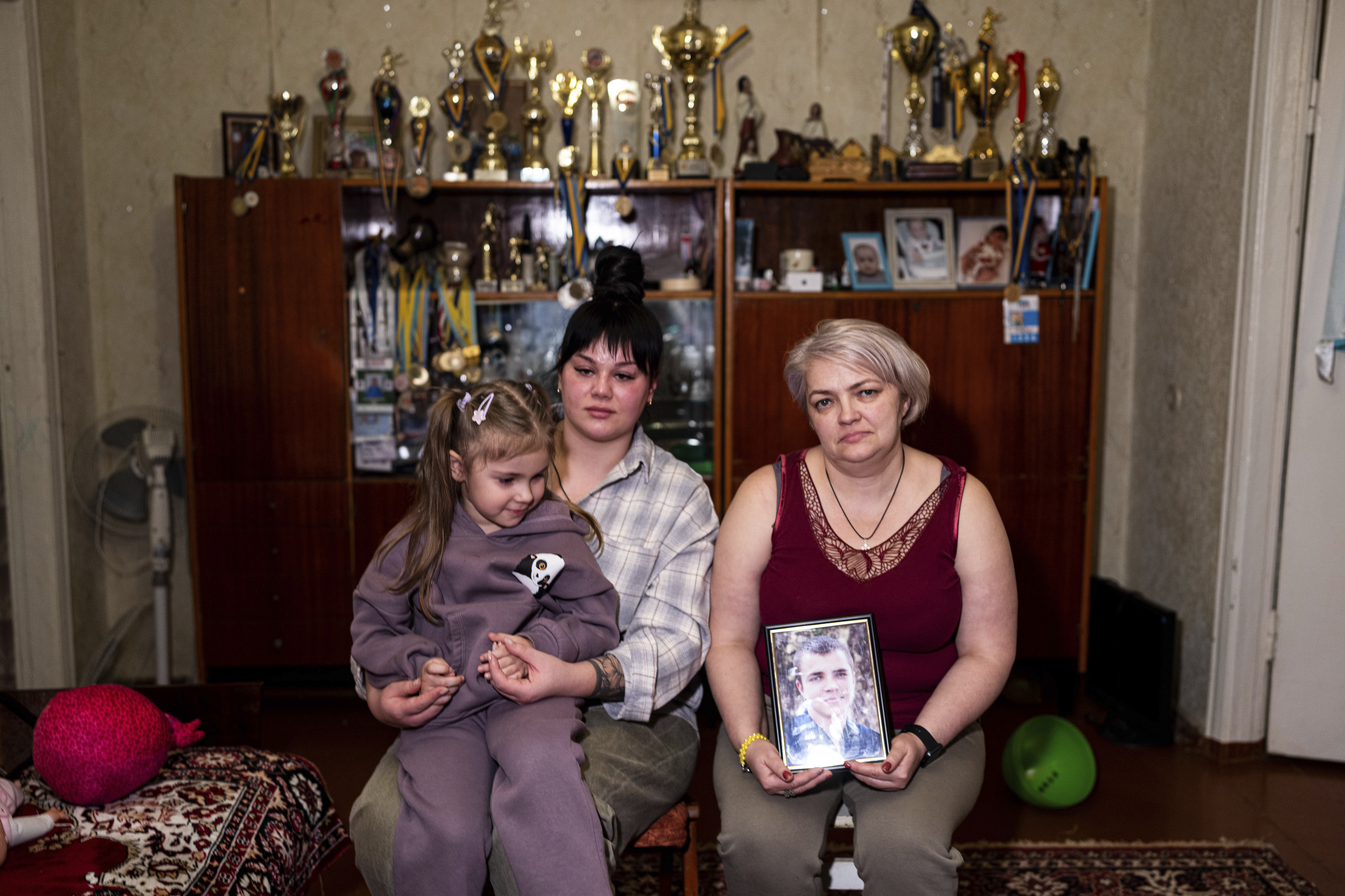 Vasilisa, with her mother, Polina Ihrak, and grandmother, Svitlana Halinicheva, sit together for a photo after returning home from a boxing tournament in honor of her father Maksym Halinichev, who was killed during fighting with Russian forces in March 2023, in Shostka, Sumy region, Ukraine on Sunday, Feb. 4, 2024. (AP Photo/Evgeniy Maloletka)