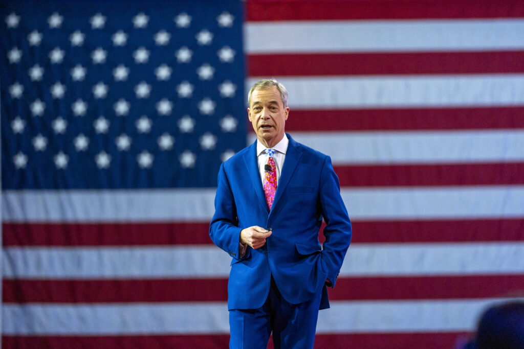 Nigel Farage taler under Conservative Political Action Conference (CPAC) i National Harbor, Maryland, den 23. februar 2024. Foto: Alex Brandon / AP / NTB.
