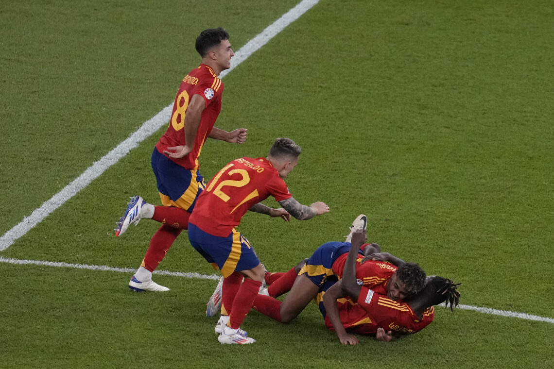 Så scorer Nico Williams etter ett minutt! Spania leder, og det ser håpløst ut for England. Pasning: Lamine Yamal, som var 16 år på fredag.
