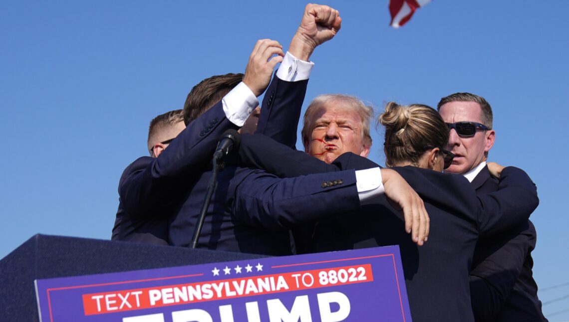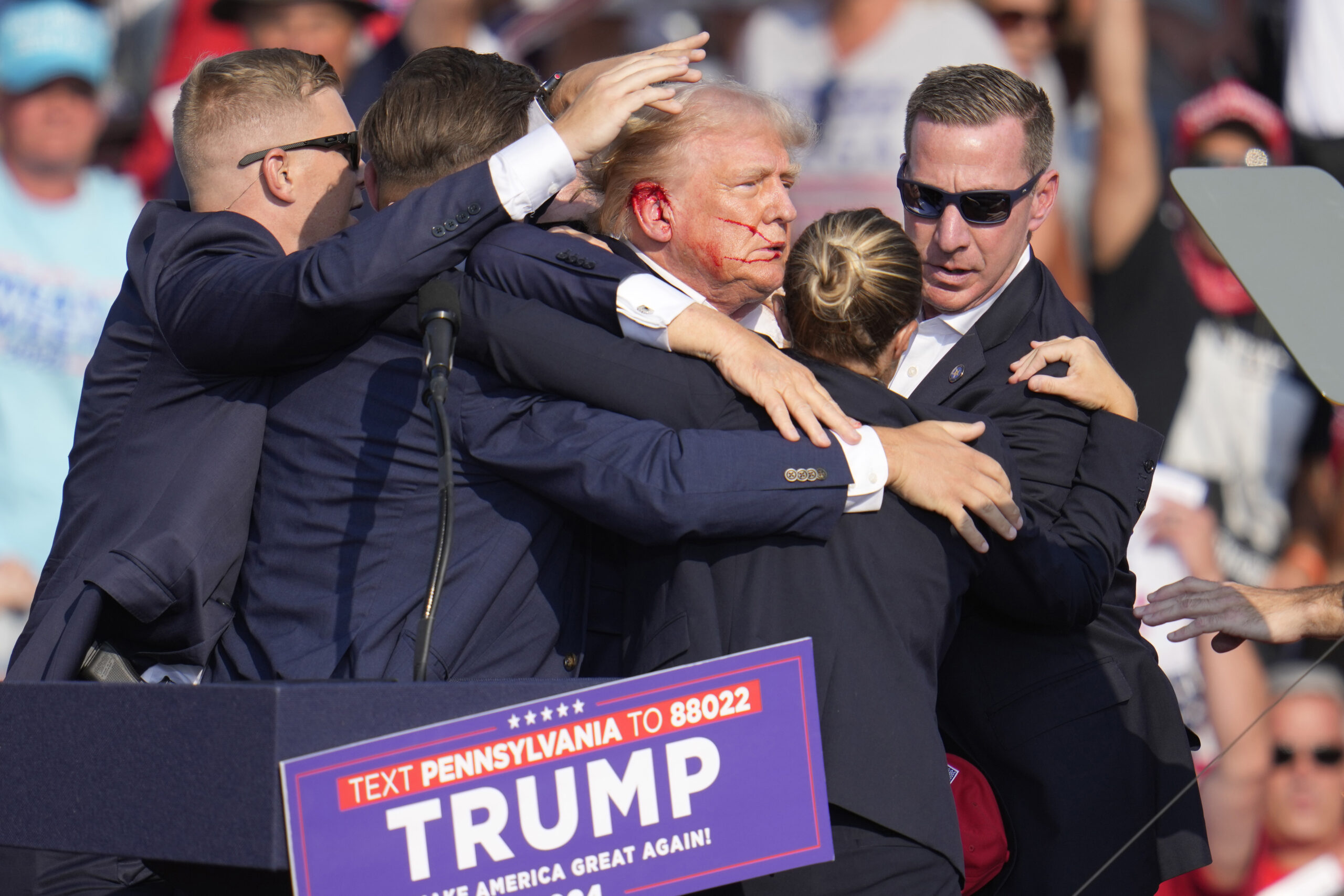 Underveis i talen under et valgkampmøte i Pennsylvania, ble det hørt flere skudd avfyrt under livesendingen. Donald Trump tok deretter en hånd mot nakken, og bøyde seg ned. Han mistet deretter capsen, og sikkerhetsvaktene stormet til.