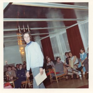 Deltidspasifisten ropes opp som vinner av skirennet på Sjusjøen i februar 1970. Motstanderne var en busslast gamle danske damer og en svensk friskus som ikke fikk med seg at man måtte tegne en gris etter målgang. Pluss en del barn (små). (Foto: Sigrid Tholander)