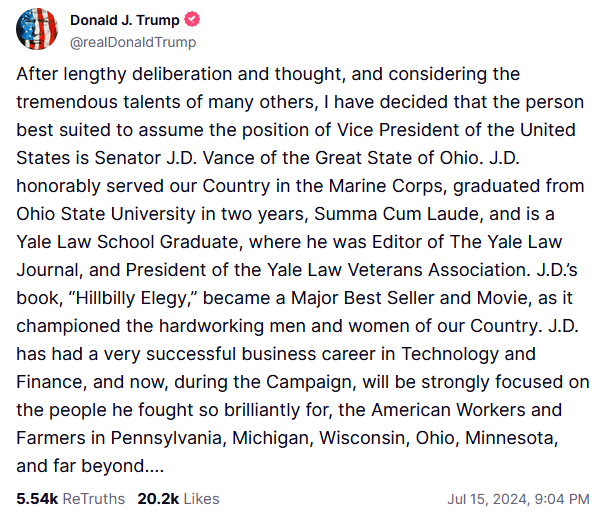 J.D. Vance har markert seg som en sterk støttespiller for Donald Trump. Han er 39 år gammel, og ble valgt som senator for Ohio i 2022, som følge av at Rob Portman gikk av som senator.