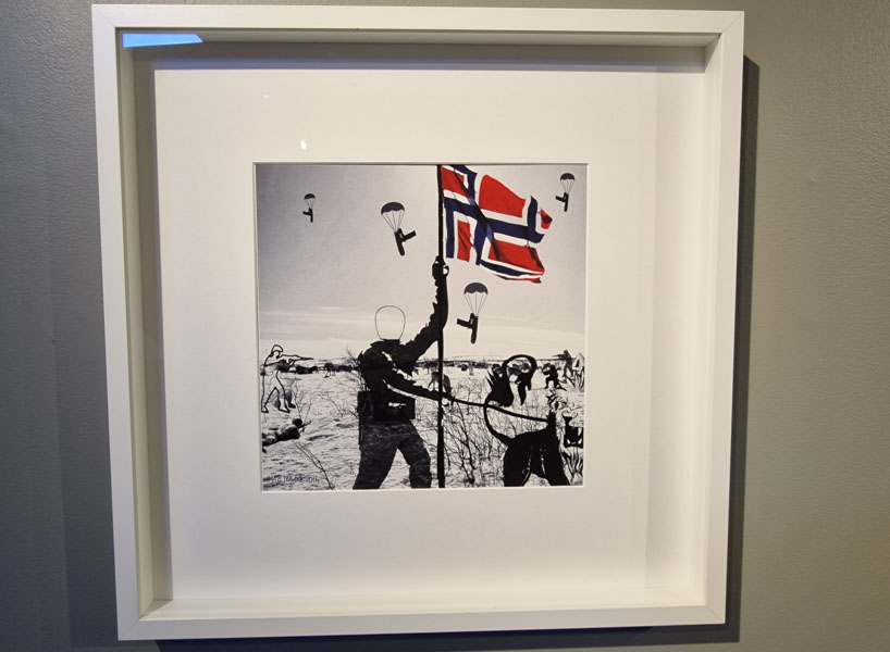 Máret Ánne Sara, Årets olsokkunstner 2023, Stiklestad. Utstillingen til kunstneren fra Kautokeino påsto at nordmenn koloniserer sameland, og hun hadde utrustet det norske flagget med hakekors og omgjort den norske løve til et uhyre som glefser i seg rein. Foto: Bente Haarstad.