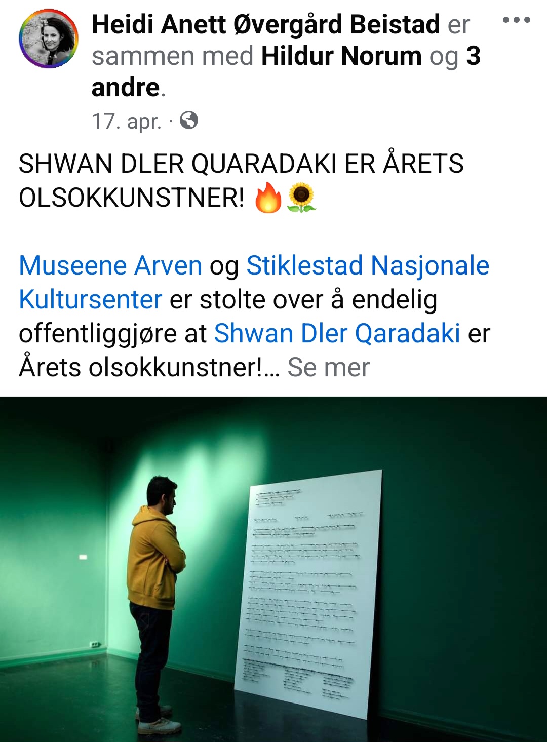«Shwan Dler Qaradaki er en norsk billedkunstner», skrev Stiklestad-ledelsen på Facebook da de lanserte årets olsokkunstner i april. Selv om han kaller Irak for «hjemme» og reiser dit på ferie. Illustrasjonen er av kunsten han laget i raseri mot norske myndigheter, som ikke ville gi ham opphold. Skjermdump.