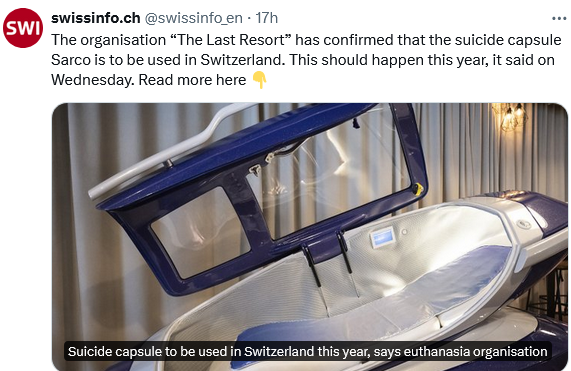 Organisasjonen «The Last Resort» hevder at selvmordskapselen Sarco skal tas i bruk i Sveits i år. Dette melder Swissinfo.
