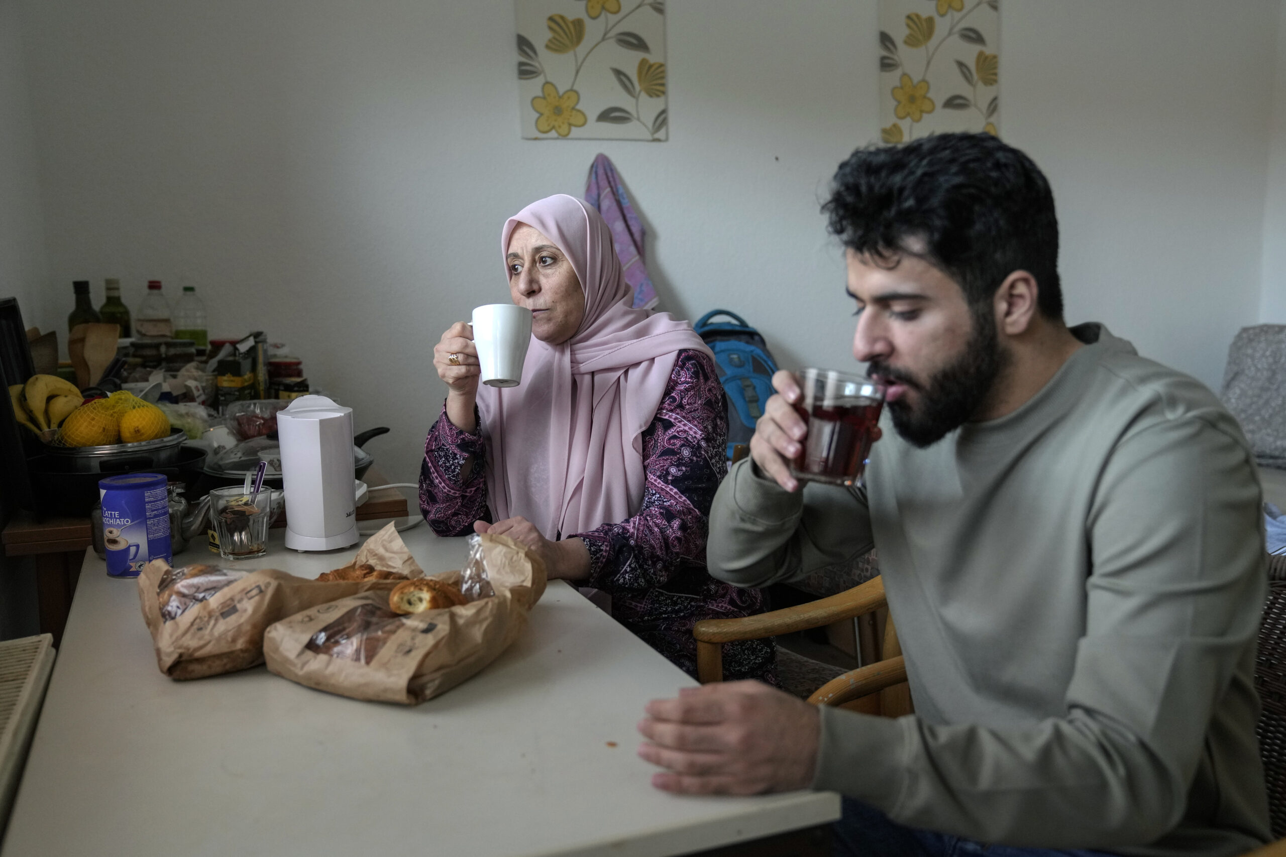 Den palestinske asylsøkeren Jihad Ammuri (20) og hans mor Amileh Saqer (68) drikker te i et asylmottak i Eichsfeld den 24. april 2024. Foto: Ebrahim Noroozi / AP / NTB.