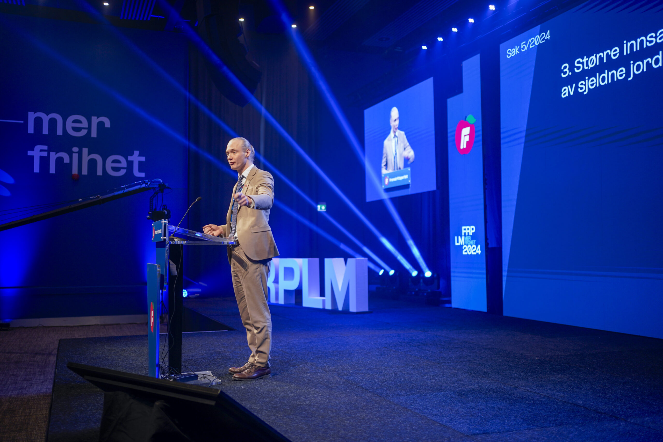 Simen Velle på Fremskrittspartiets landsmøte på Gardermoen den 21. april 2024. Foto: Terje Pedersen / NTB.