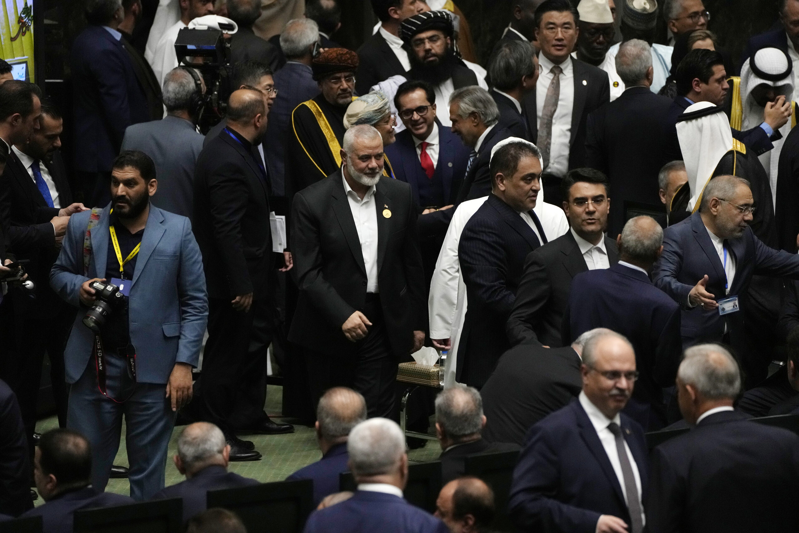 Hamas chief Ismail Haniyeh, center, arrives at the Iranian parliament to attend the swearing-in ceremony of newly-elected President Masoud Pezeshkian, in Tehran, Iran, Tuesday, July 30, 2024. (AP Photo/Vahid Salemi)