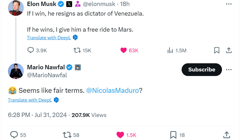 Venezuelas president Nicolás Maduro har utfordret Elon Musk til fjernsynsduell efterat Musk i sosiale medier åpent har støttet opposisjonens påstander om storstilet valgsvindel.