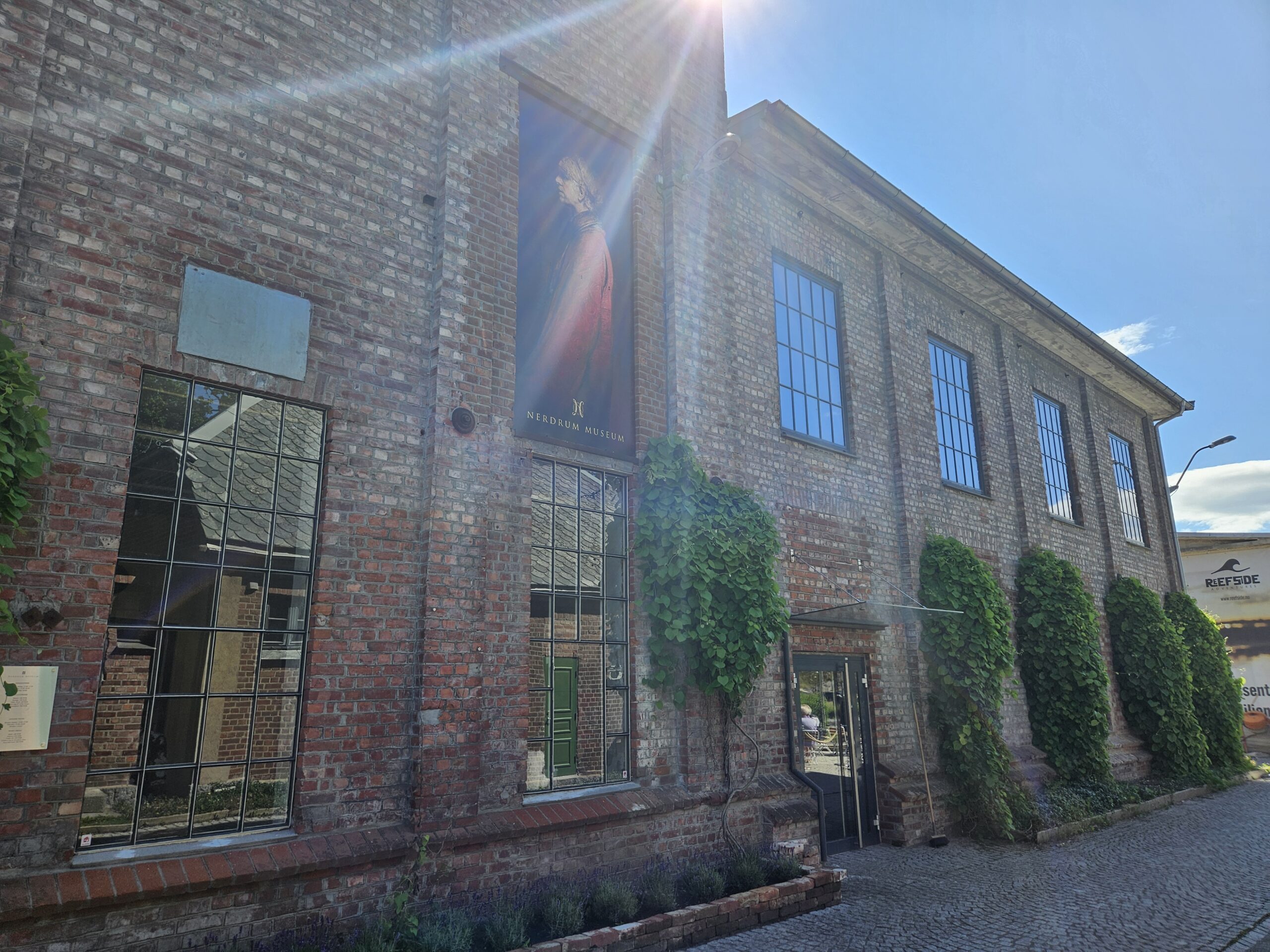 Arkitektonisk sett er museet meget tiltalende. Det er en gammel fabrikkbygning i teglsten, visstnok en tidligere fyrstikkfabrikk, som med sin auratiske alder og arv vil kunne bidra til holde dette Nerdrum-prosjektet i fyr og flamme. Så noen ord om museumskafeen som var et stort lyspunkt i den ellers så mørkstemte Nerdrum-retorikken. Her ble kaffen servert i stilige porselenskopper av godt gammelt merke, med hjemmebakte kaker som smakfullt tilbehør. Endelig går solsystemet på skinner.