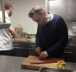 Selv i sivilt klarer ikke Sven Erik Renaa å holde seg unna kjøkkenet når rabarbraen ankommer. Foto: FB/ Matbaren