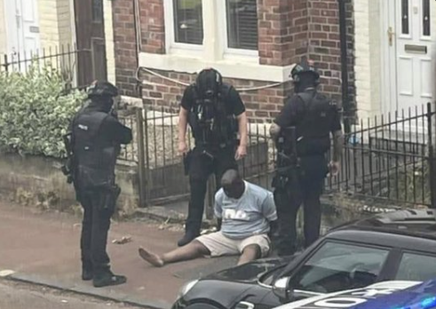 Politiet rapporterte at den aktuelle mannen deretter hadde angrepet en mannlig politibetjent med en «knivlignende gjenstand» og forårsaket skade på politibetjentens arm. Han flyktet deretter til fots, men ble arrestert i Rodsley Avenue i Gateshead.