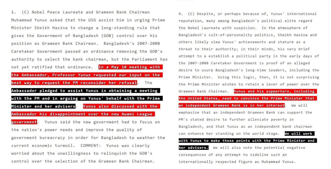 Wikileaks hevder at mikrolånmogulen Yunus ikke bare blir ønsket velkommen av USA, men som Wikileaks-dokumenter viser, det var etablert et nært forhold mellom ham og Washington allerede før landet havnet i krise: