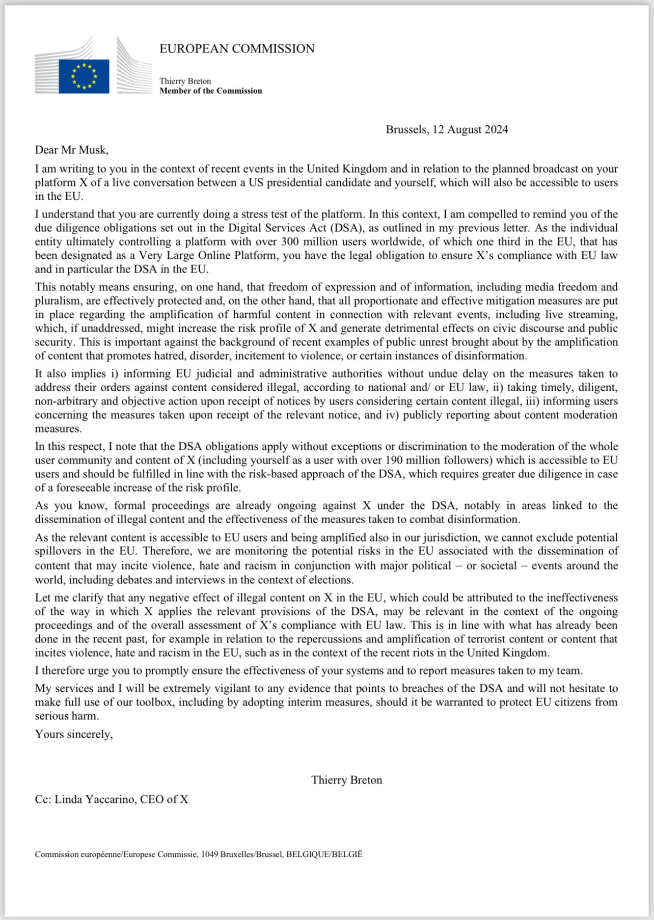I am writing to you in the context of recent events in the United Kingdom and in relation to the planned broadcast on your platform X of a live conversation between a US presidential candidate and yourself, which will also be accessible to users in the EU.