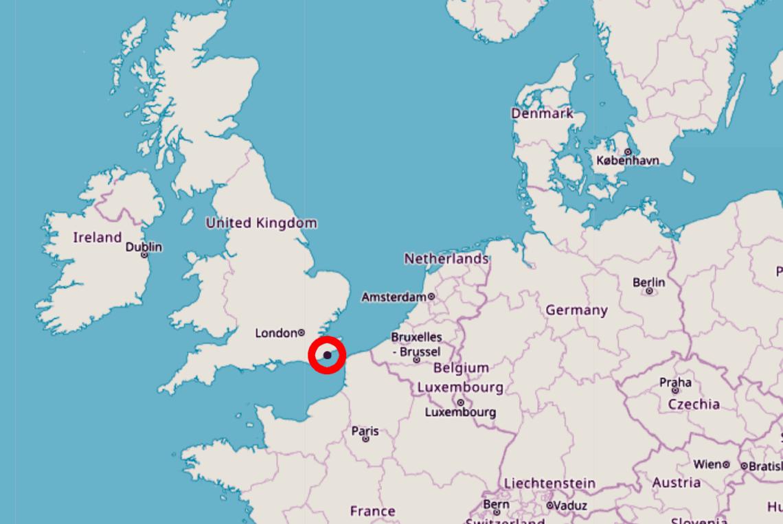 Målestasjonen i Kent i England er den eneste på det interaktive kartet over radioaktivitet som viser stråling på mer enn 2000 nanosievert per time. (Skjermbilde fra EU-kommisjonens nettsted)