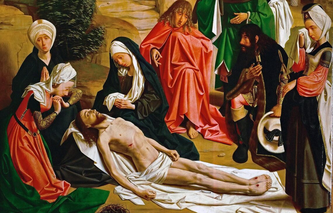 Det ser ut som om det tekstlige grunnlaget her er hentet fra evangeliet etter Johannes, spesielt 19, 38-42.