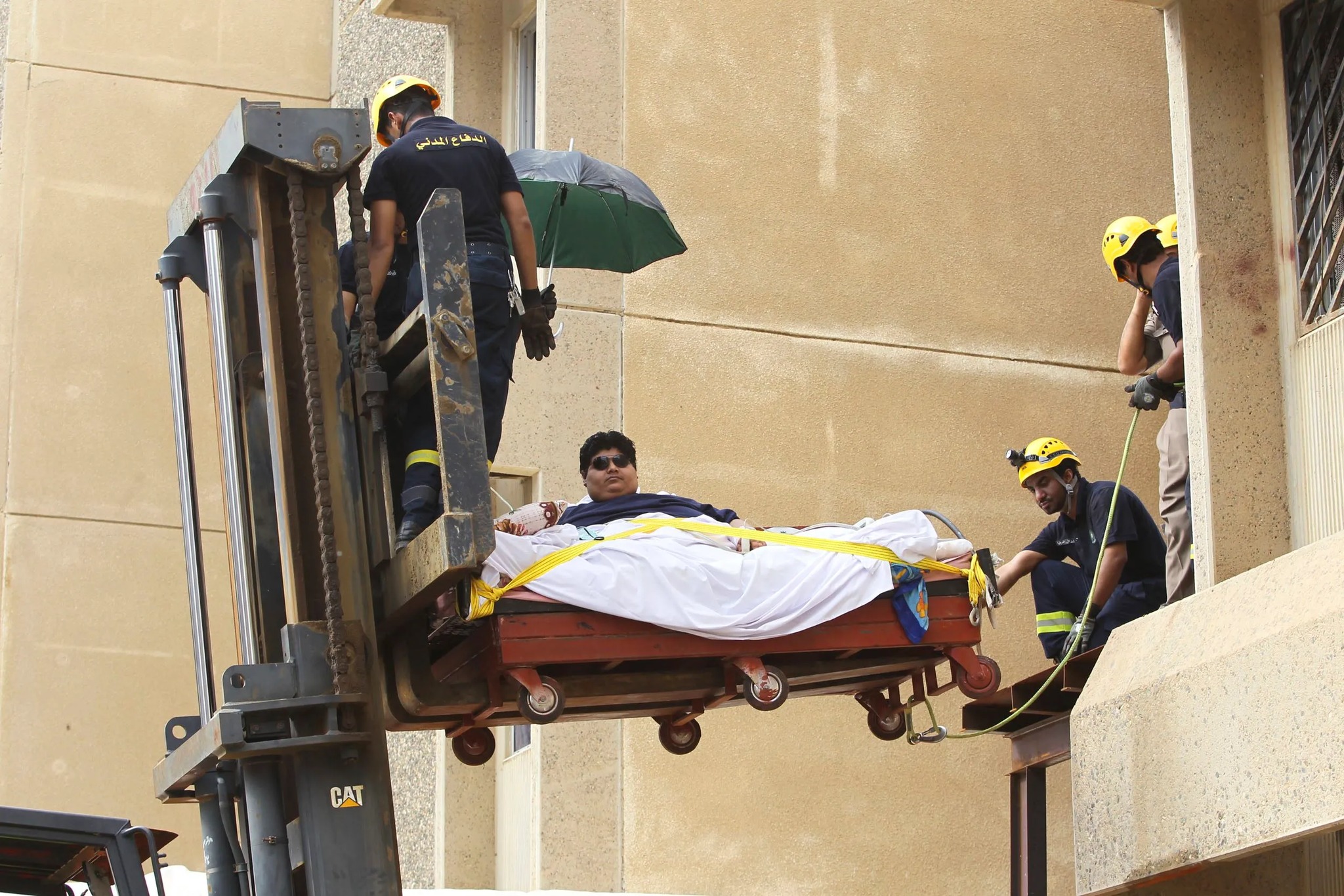 Khalid bin Mohsen Shaari fraktes ut av sin leilighet ved hjelp av gaffeltruck. Skjermdump fra Facebook