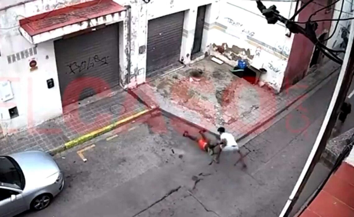 I stedet for å flykte, ser vi det ubevæpnede offeret utfordre knivmannen gjentatte ganger, før en annen angriper kommer bakfra og sparker offeret så han faller. Gutten på bakken blir deretter stukket minst fire ganger i halsregionen før knivmannen stikker fra stedet. To separate forbipasserende blir vitner til volden, uten å gripe inn.