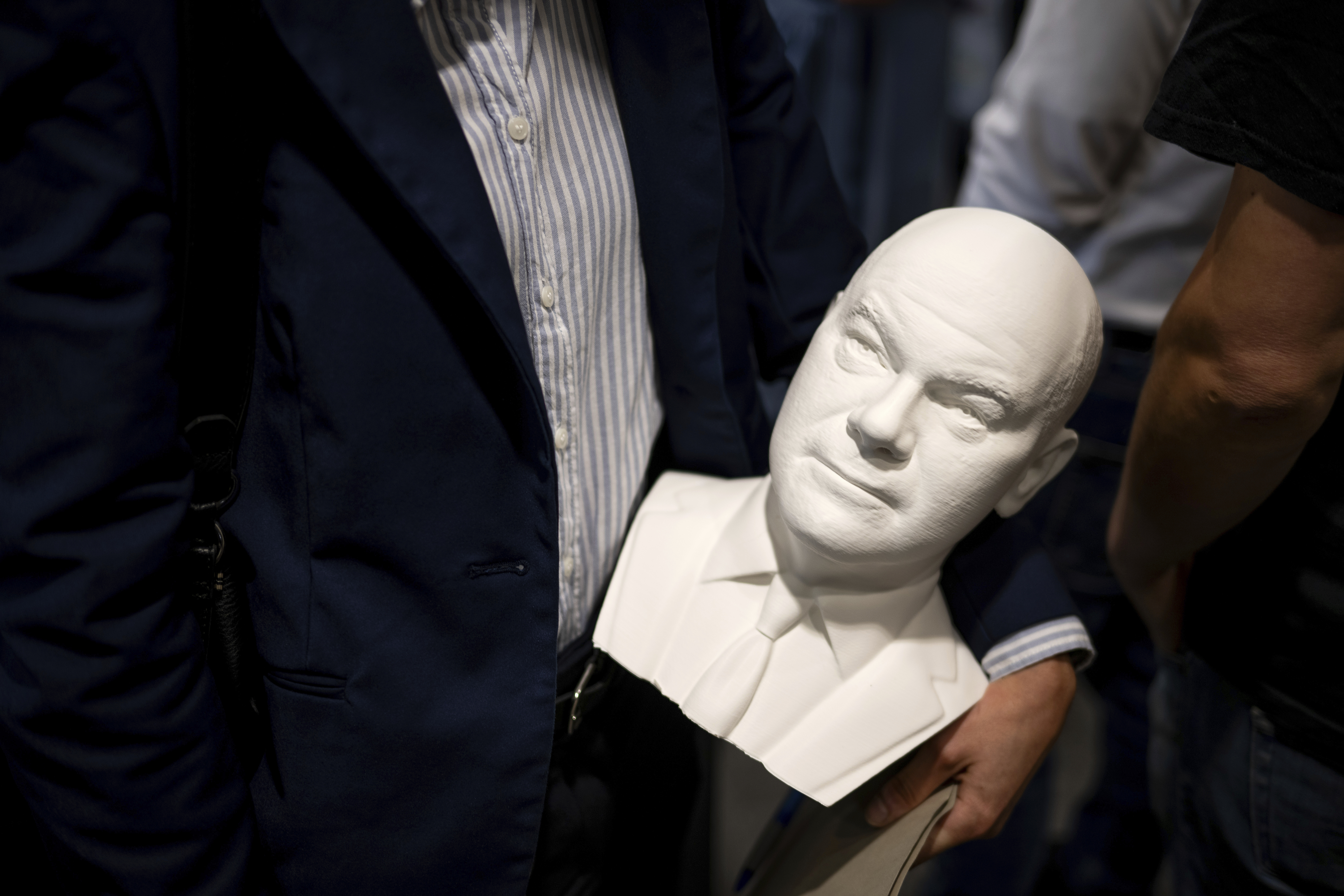 Tysklands statsminister Olaf Scholz holder en 3D-printet byste han har fått i gave under et besøk hos Hasso Plattner-instituttet i Potsdam den 23. august 2024. Foto: Sebastian Christoph Gollnow / DPA via AP / NTB.