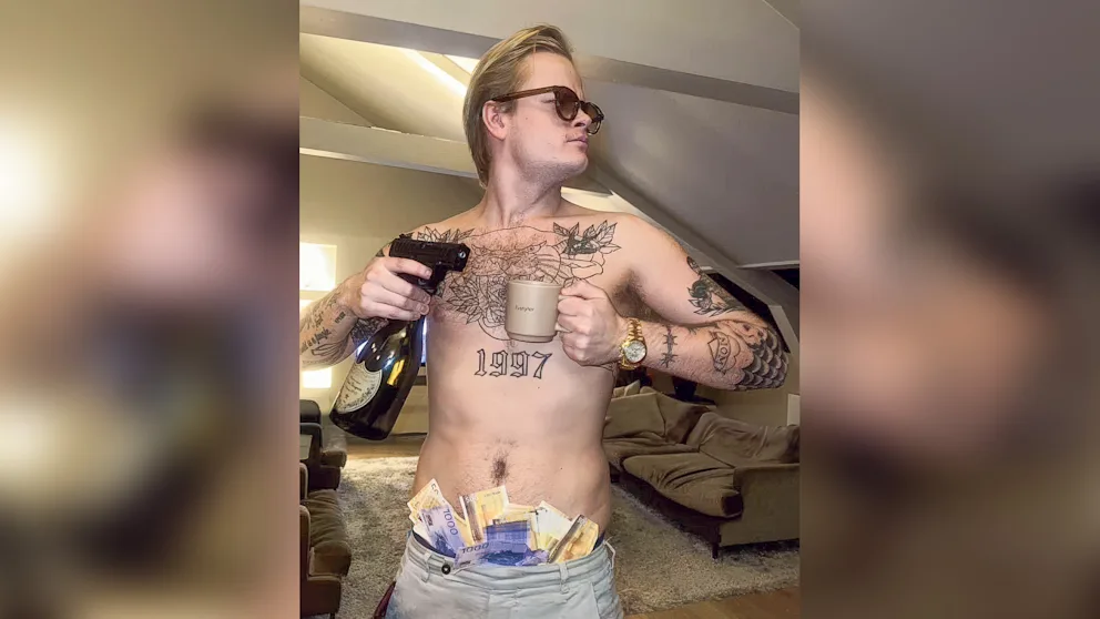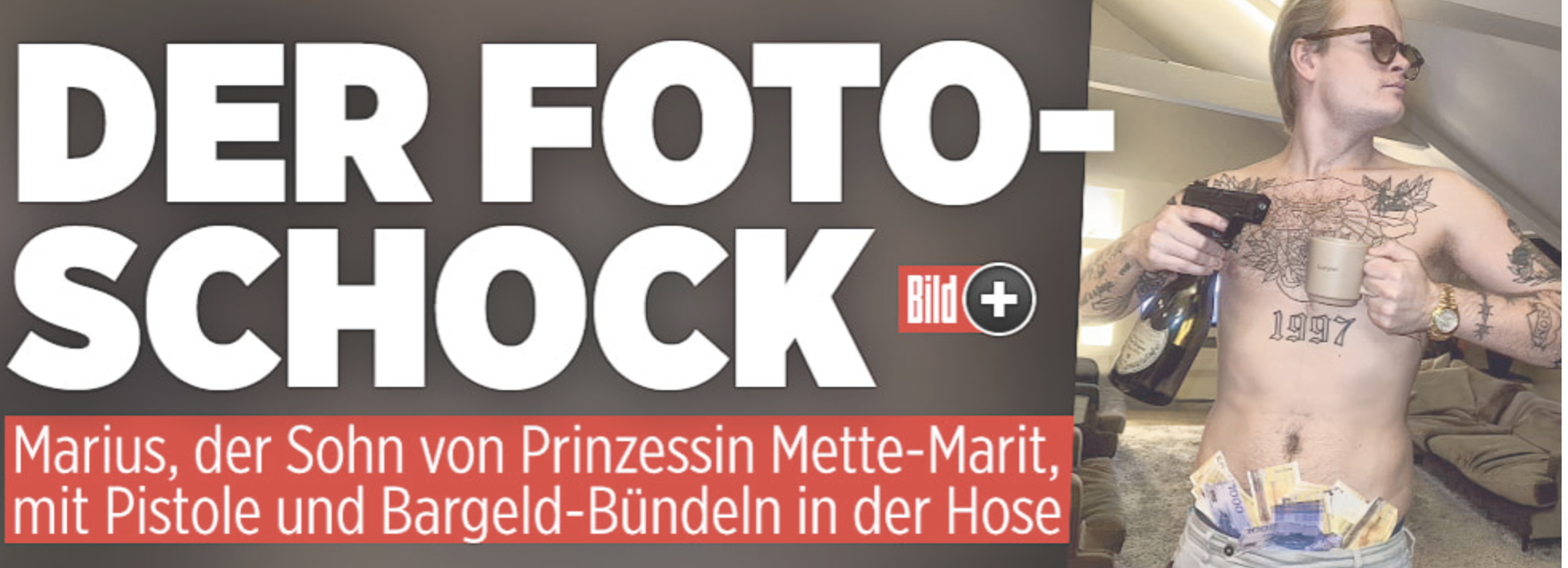 Den tyske storavisen Bild publiserer et bilde av Marius Høiby som står med naken overkropp, en pistol i hånden og bukselinningen stappfull av kontanter. Avisen spør hva som skjer med det norske kongehuset. Det er et kompromitterende bilde, som nå går verden rundt.