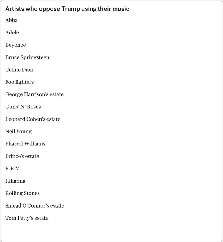 Foo Fighters, Céline Dion, Beyoncé, Johnny Marr fra The Smiths, boet etter den avdøde sangeren Sinéad O’Connor og familien til den avdøde soulsangeren Isaac Hayes har tidligere bedt Trump om å slutte å spille sangene deres. Hayes’ familie har til og med gått til søksmål mot Trump.