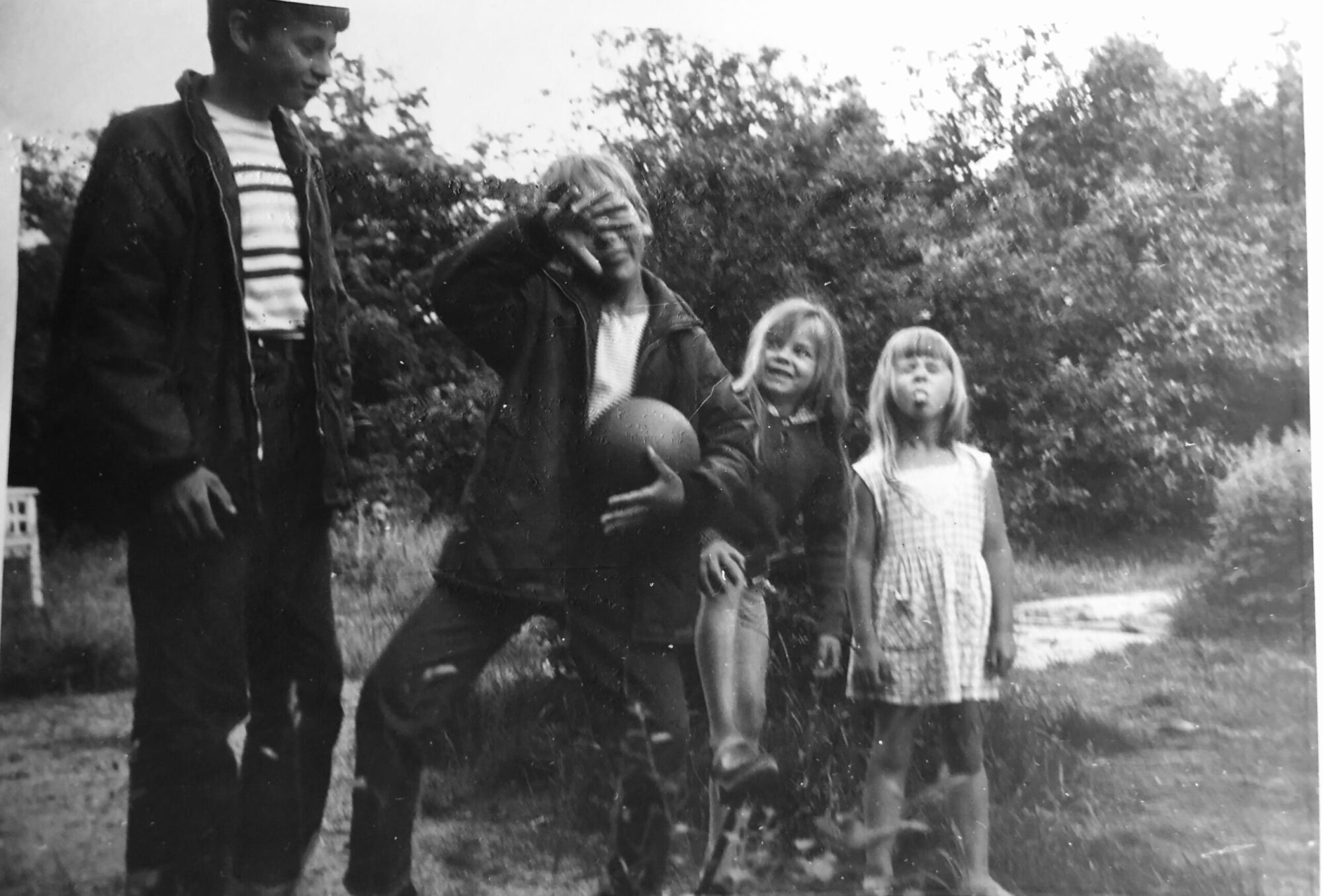 I Skåne. Jeg til venstre. Deretter Jakob, Aino og Rebecca. Jeg elsket søstrene mine. De kunne løpe med tresko. Foto: Privat.