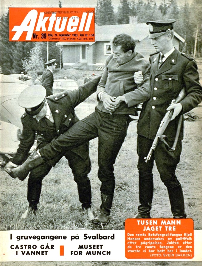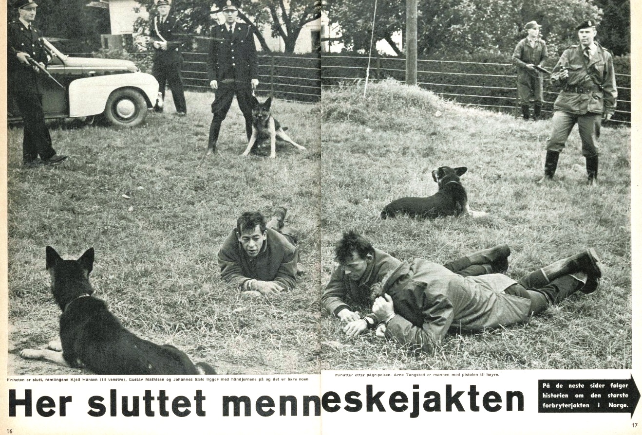 Høstdramatikk: Den storstilte jakten på rømlingene fra Botsfengselet. De befant seg i skogene i nabolaget, og de var farlige. Alle gutter frydet seg. Begge foto: Aktuell, 21. september 1963.