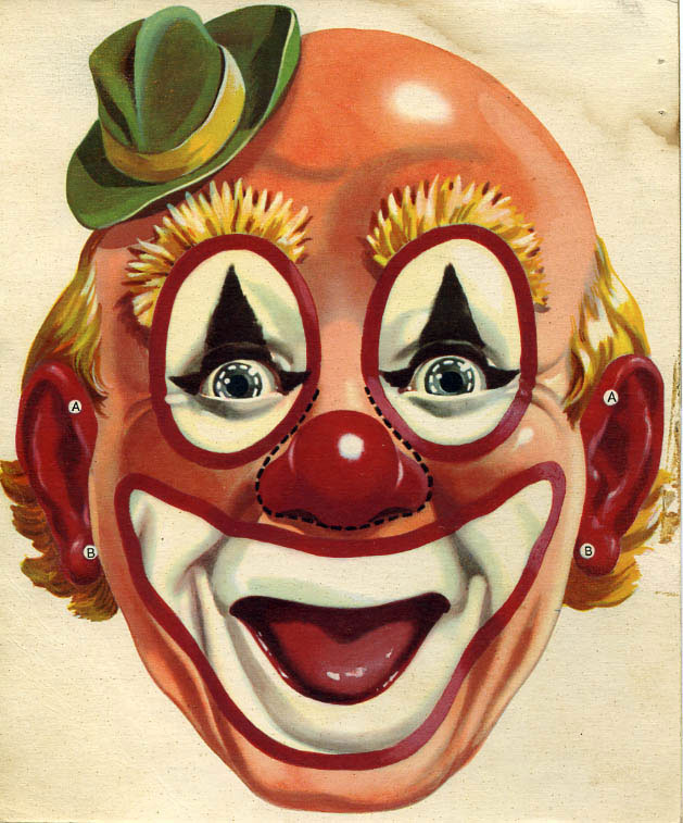 Corn Flakes-esken var ettertraktet, for på baksiden var det masker til å klippe ut. Blant annet denne skumle klovnen. Foto: Kellogg’s.