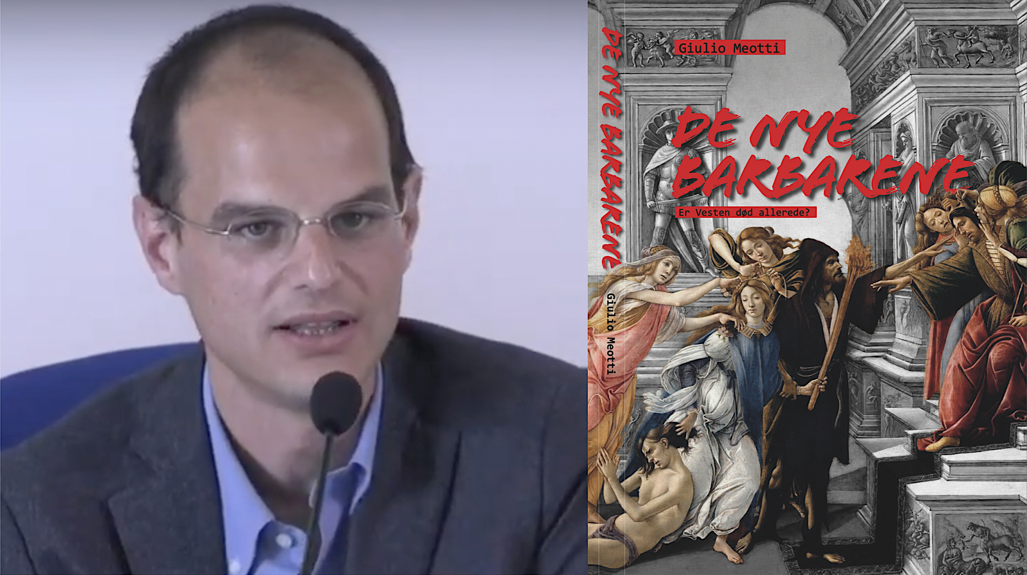 Giulio Meotti og hans bok «De nye barbarene». Stillbilde av forfatteren: magic stream / YouTube. Omslag: Document.