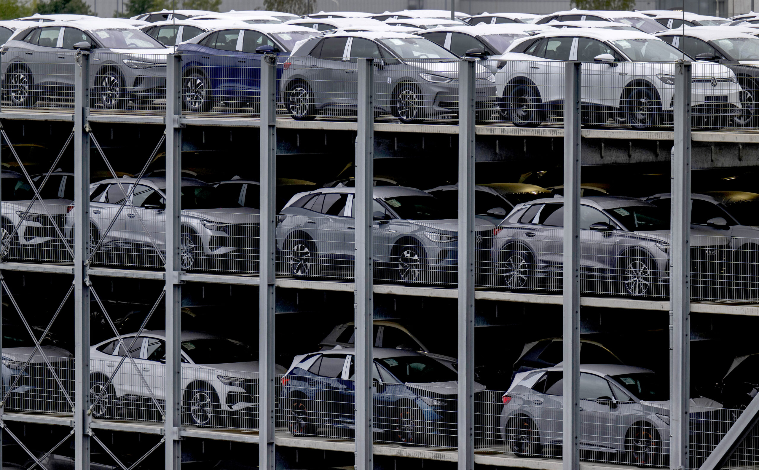 Elbiler fra Volkswagen står parkert utenfor det tyske bilkonsernets fabrikk i Zwickau i Sachsen den 14. september 2023. Foto: Hendrik Schmidt / DPA via AP / NTB.