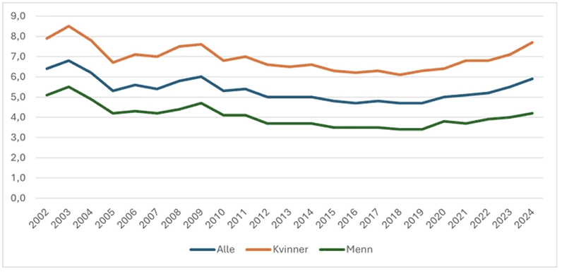 Det legemeldte sykefraværet økte fra 5,5 prosent i 2. kvartal 2023 til 5,9 prosent i 2. kvartal 2024. Dette er det høyeste legemeldte sykefraværet i et 2. kvartal siden 2009, da Norge var preget av svineinfluensa.