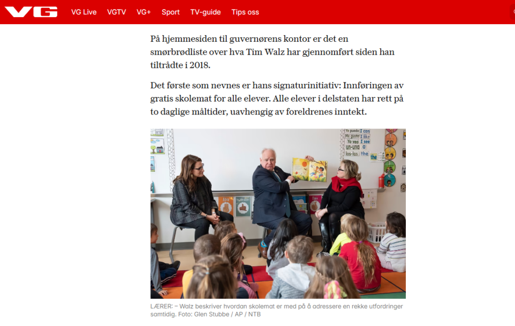 Visepresidentkandidat Tim Walz signaturpolitikk har vært å innføre skolemat for alle. Hvorfor klarer vi ikke det i Norge?, skriver Andreas Viestad i VG.
