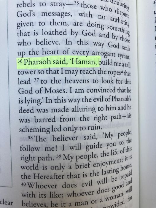 Ifølge Koranen 40,36-37 hadde den farao som Moses viser til i Bibelen et møte med Haman fra Esters bok. Men problemet er at denne faraoen levde minst 1300 år før Kristus, mens Haman levde 400 år før Kristus. Faraoen hadde allerede vært død i flere hundre år da Haman ble født, og med nesten 1000 års mellomrom mellom disse to er det umulig at de kan ha møtt hverandre.