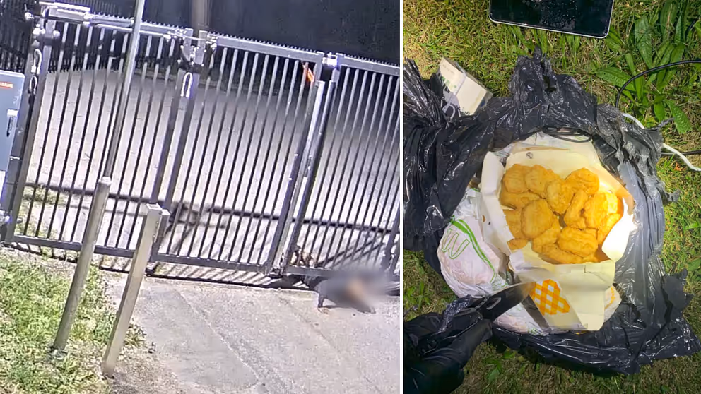 Mannen, som er 25 år gammel, ble fanget på overvåkningskameraer da han krøp under porten til Östragård fengsel. Med seg hadde han en pose med mat fra en hamburgerrestaurant og en mobiltelefon.