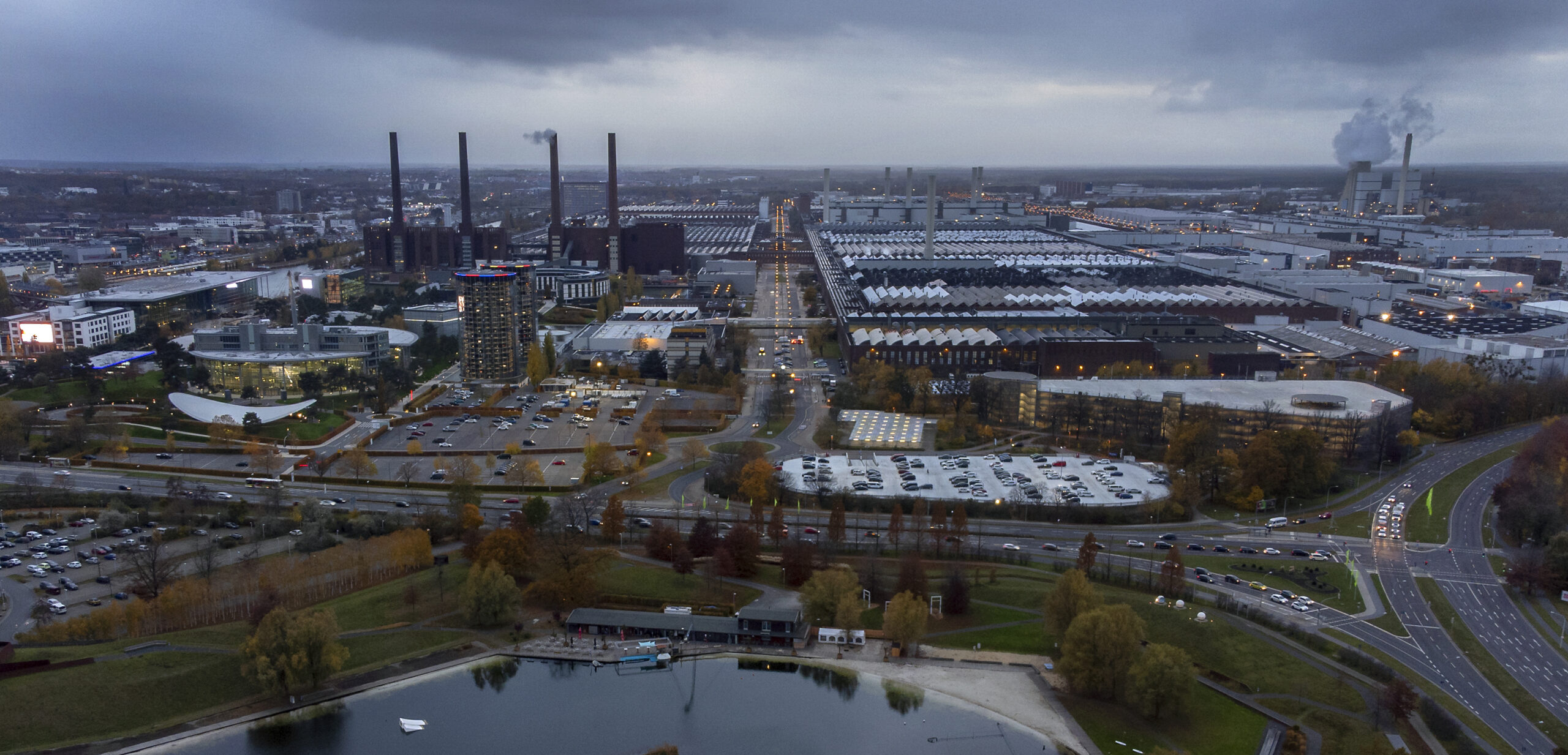 Utsikt til Volkswagen-fabrikken i Wolfsburg den 8. november 2021. Konsernet kunngjorde nylig at VW-fabrikker i Tyskland kan bli nedlagt. Foto: Michael Sohn / AP / NTB.