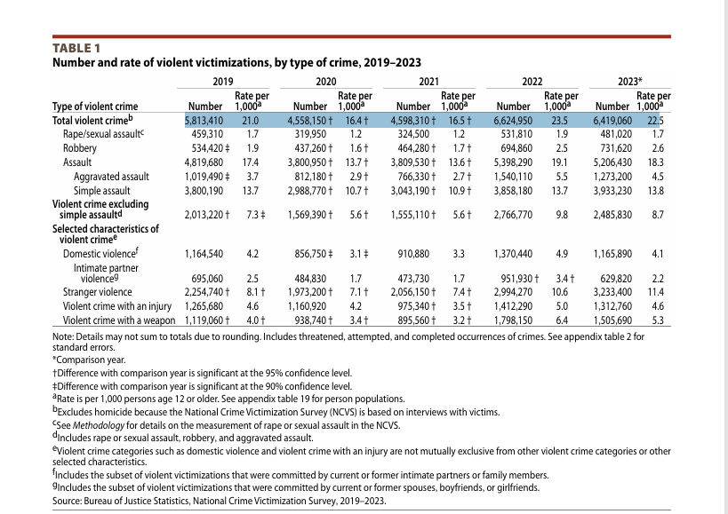 Justisdepartementets undersøkelse fra USAs statistikkbyrå Bureau of Justice Statistic (BJS) viser at 22,5 av 1000 innbyggere rapporterte at de hadde blitt utsatt for voldskriminalitet i 2023, og 102,2 per 1000 rapporterte at de hadde blitt utsatt for eiendomskriminalitet.