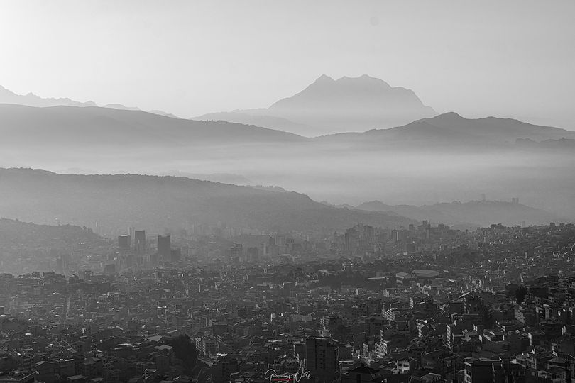 I regjeringssetet La Paz, oppe i Andesfjellene og hundrevis av kilometer unna brannene, lukter det røyk, og sikten er redusert. Et bilde fra den nye byen El Alto, som ligger på høysletten over La Paz, rundt 4100 meter over havet:
