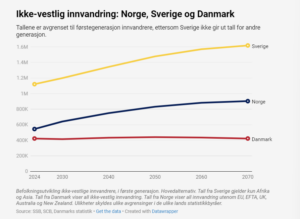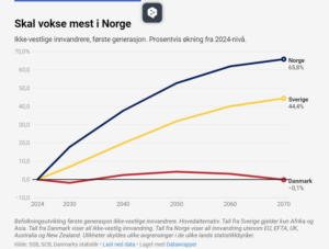 Wiborg reagerer sterkt på anslaget for ikke-vestlige innvandrere til Norge, Sverige og Danmark de neste tiårene. Her anslår Statistisk sentralbyrå (SSB) at Norge vil ha høyere innvandring fra ikke-vestlige land per capita enn både Danmark og Sverige, skriver Nettavisen.