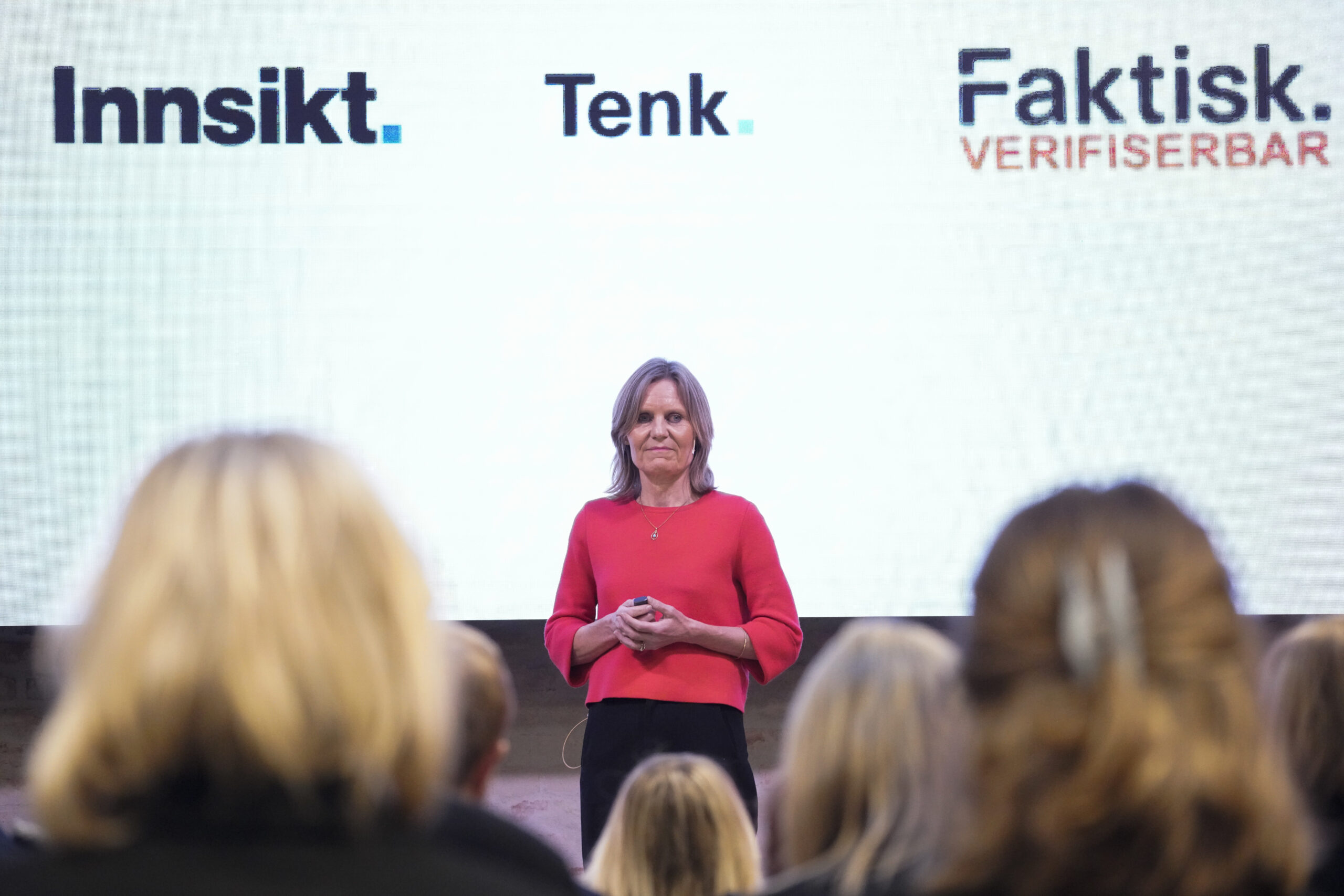 Styreleder Helje Solberg i Faktisk.no, som også er nyhetsdirektør i NRK, innleder fra scenen når kong Harald og kronprins Haakon besøker Faktisk.no i Pressens hus i Oslo den 23. januar 2024. Foto: Ole Berg-Rusten / NTB.