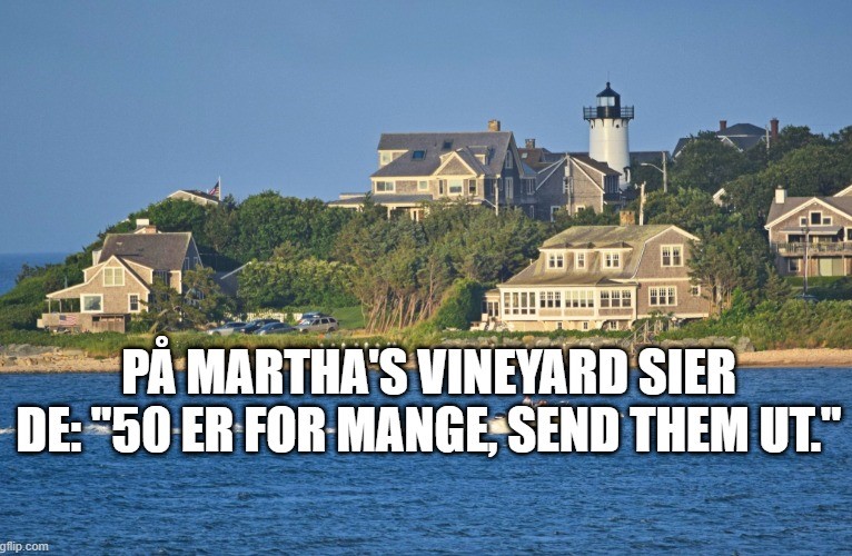 For å blidgjøre venstresiden, bør nok befolkningen i Springfield ta lærdom av eliten i Martha’s Vineyard. Øya er ikke bare en «sanctuary town», men befolkningen er «edumecated» nok til å vite at Amerika er bygget på å ta imot the «tired and the poor», som med skinnende iPhones i hendene spør hva Amerika kan gjøre for dem.
