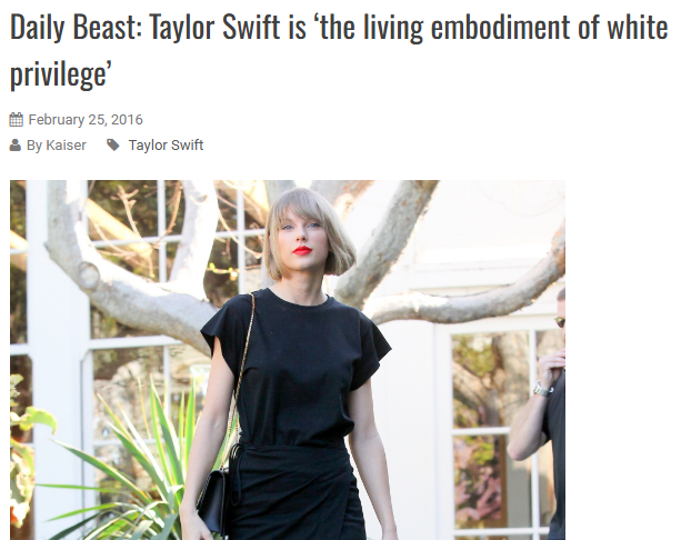 Den skarpeste kritikken kom fra The Daily Beast, som i 2016 skrev at Taylor Swift var et levende eksempel på hvite privilegier. Samme år skrev den venstrevridde nettsiden at Swift ikke er «mer innflytelsesrik» enn Kanye West, selv om en undersøkelse viste at hun var nettopp det.