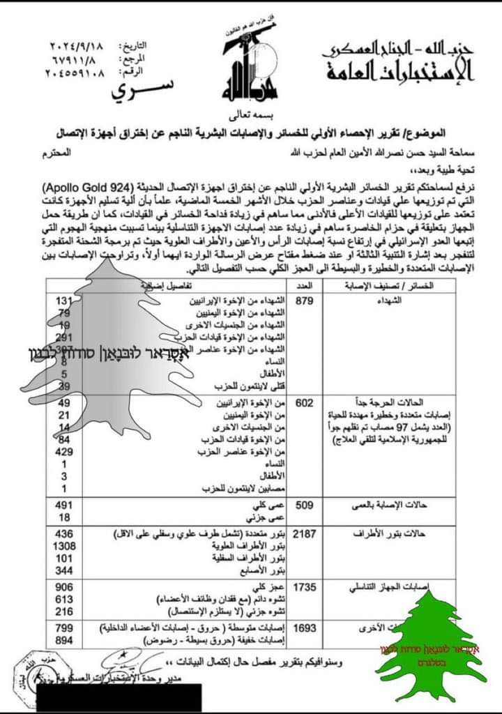 Et dokument som påstås å være et lekket Hizbollah-etterretningsdokument sirkulerer nå på sosiale medier. Dokumentet gir en redegjørelse for skadene medlemmer av terrorgruppen ble påført etter denne ukens angrep av de eksplosivutstyrte personsøkerne.