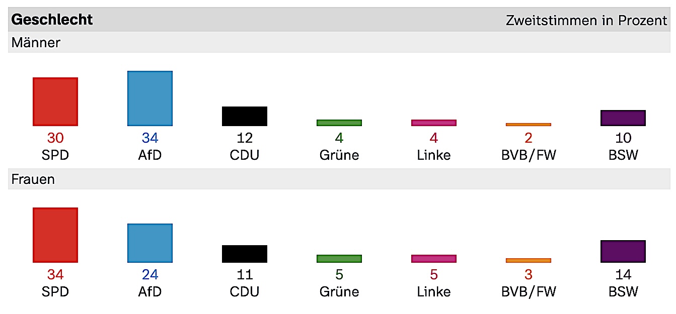 Blant menn i den tyske delstaten er oppslutningen om AfD estimert til 34 prosent, mens SPD er nest størst med 30 prosent: