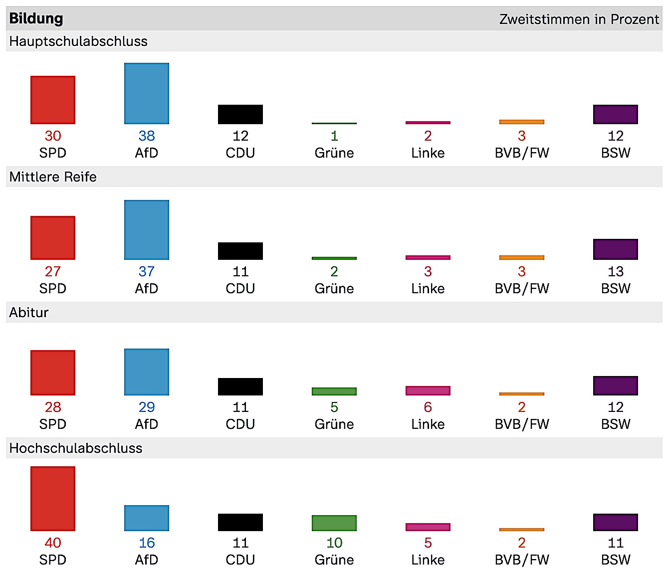 AfD er størst med 30 prosent eller mer, igjen med SPD på andreplass, i aldersgruppene under 30 år, 30–44 år og 45–59 år, mens SPD er klart større enn AfD (43–23) blant velgere over 60 år: