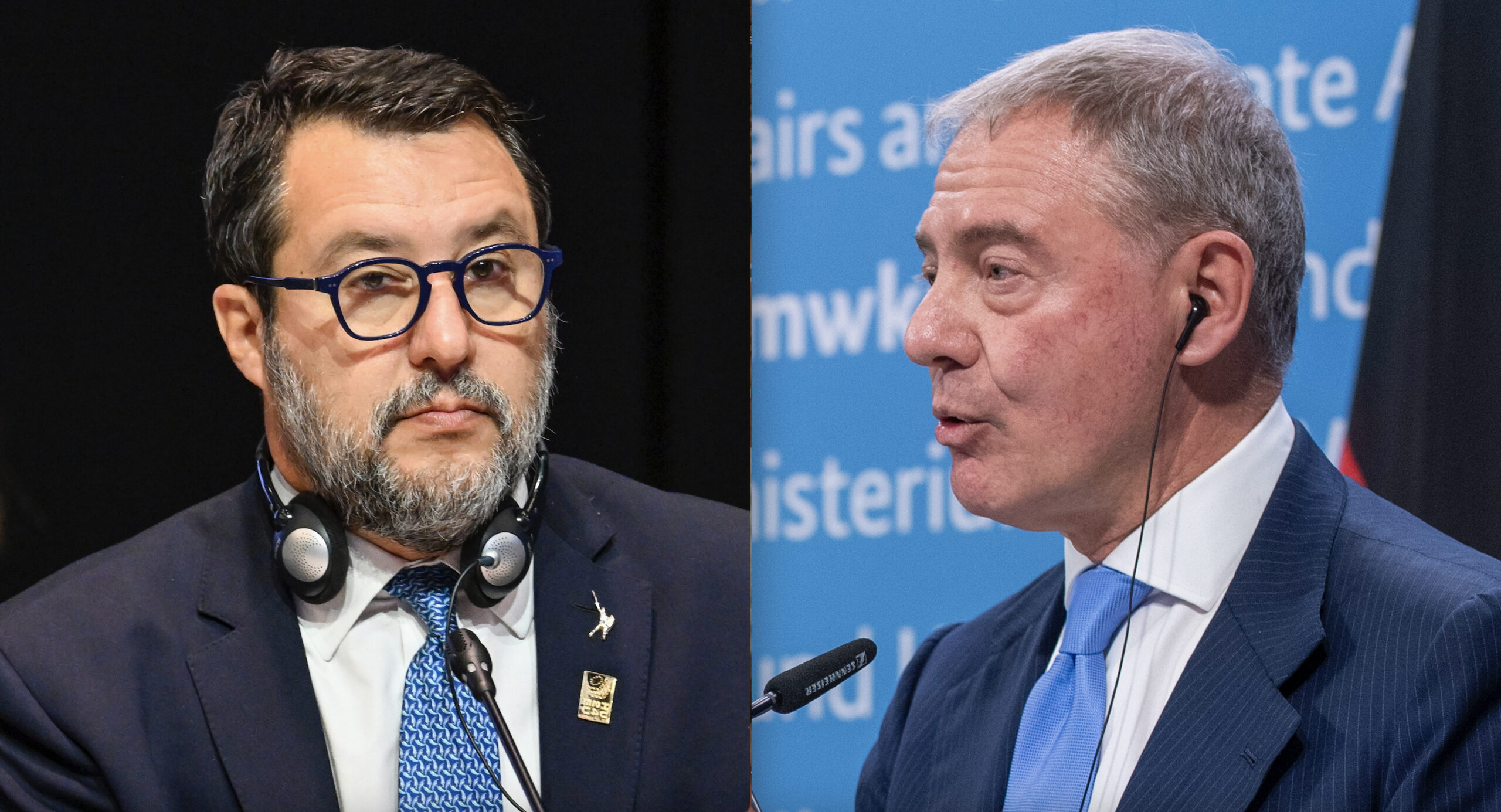 Matteo Salvini og Adolfo Urso. Foto: Tibor Illyes / MTI og Christophe Gateau / DPA – begge via AP / NTB.