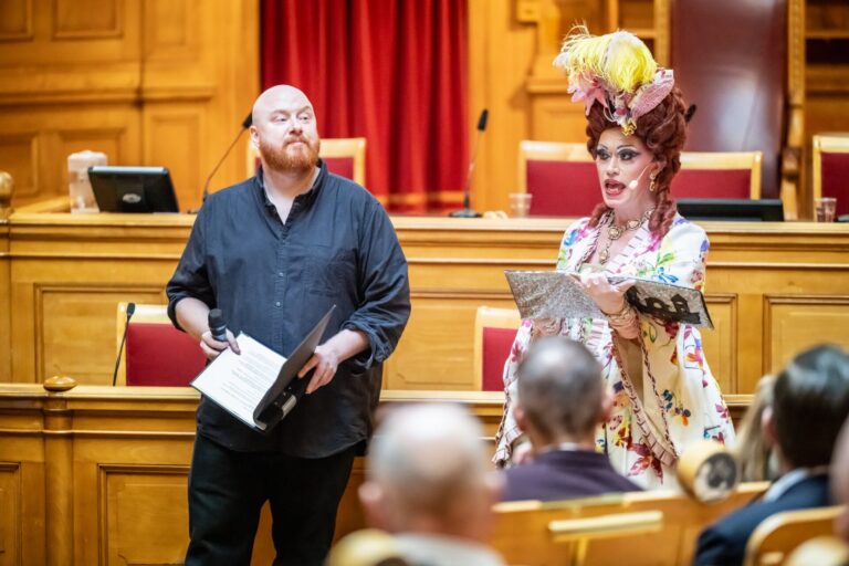 Blant drager og dragqueens Petter Wallenberg og Inga Tvivel i Riksdagen. Foto: Skjermdump Facebook