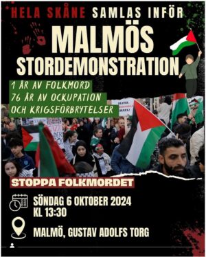 Nå er det tid for jubileet, og Palestina-gruppene har skiftet gir. De pro-palestinske demonstrasjonene som holdes i store svenske byer hver lørdag, vil nå bli «store demonstrasjoner» og «maktsamlinger» for «et år med motstand». Administratoren for Facebook-gruppen Solidaritetsgruppen För Palestina i Växjö, Mohamad Ad, skriver: