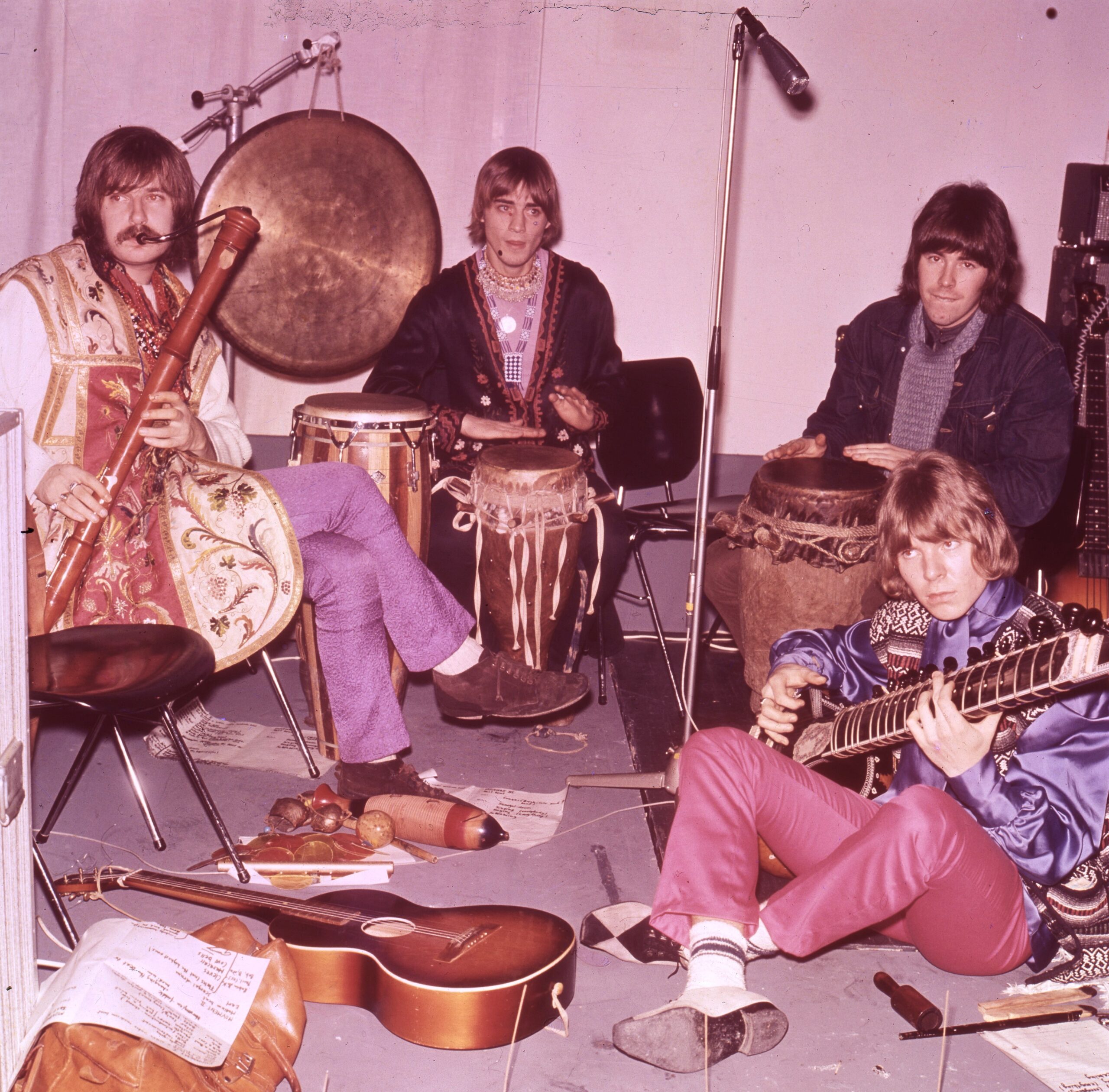Den norske supergruppen Dream. Til og med Jimi Hendrix hadde LP-en deres i hyllen. Terje Rypdal med sitar til høyre. Oppgitt over tilstandene i norsk pop. Øvrige, fra venstre Hans Marius Stormoen, Christian Reim og Tom Karlsen. Foto: Det Nyes arkiv.