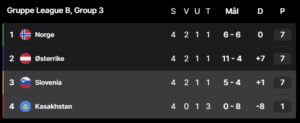 Østerrike vinner gruppen hvis de vinner sine to siste kamper, mot Kasakhstan borte og Slovenia hjemme.